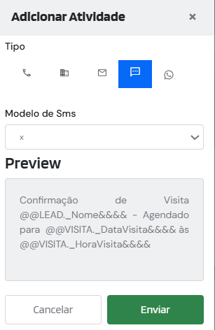 Primeiramente, você deve escolher se a atividade é do tipo E-mail, Visita, Telefonema, WhatsApp ou SMS. Cada um dos tipos de atividade tem seus campos específicos e esse tópico será abordado um pouco mais a frente na documentação.