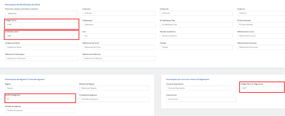 - Preencha os campos Codigo Turma, ID Período Letivo, CodFormaIngresso e Código Plano de Pagamento.