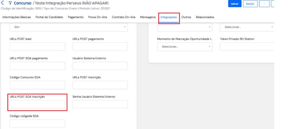 Para que a integração seja disparada corretamente, deve-se preencher no concurso o campo URLs POST SGA inscrição com a URL do endpoint de integração que será fornecida pela CRM Educacional.